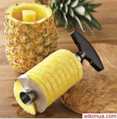 Chúng ta mua dưa về cắt bỏ 2 đầu sâu 1 chút để vừa hở phần thịt dứa. Đặt dụng cụ gọt vào giữa cứ thế xoáy dần xuống bên dưới. Khi nào hết tận cuối quả chúng ta rút dụng cụ ra và được phần thịt dứa vô cùng thơm ngon mà không hề còn chút mắt bẩn nào. Phần ruột cứng quả dứa cũng đã được loại bỏ nên chúng ta chỉ cần dùng dao cắt thành miếng theo yêu cầu của mình thôi.