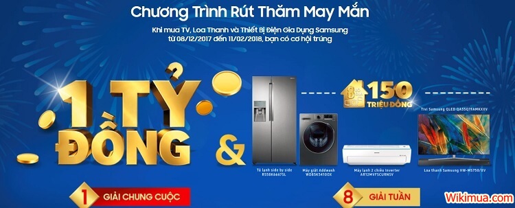 Ngoài ra, tất cả các đơn hàng mua hàng gia dụng của Samsung sẽ được tham gia chương trình rút thăm may mắn với 8 giải tuần trị giá 150 triệu đồng/giải và một giải rút thăm may mắn chung cuộc trị giá 1 Tỷ đồng.
