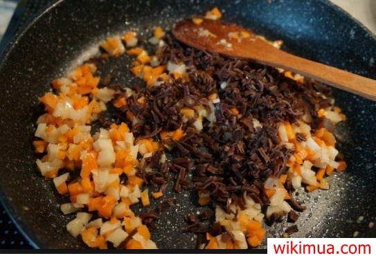 Mọc nhĩ, nấm đông cô, nấm bào ngư ngâm nước nóng cho nở ra mềm, rửa sạch và đem thái mỏng.