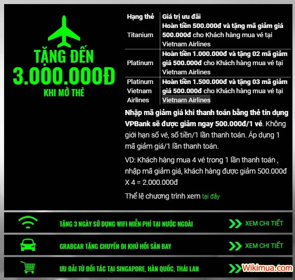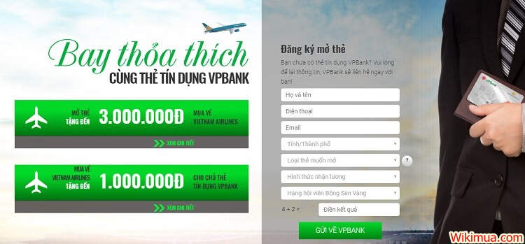 Bên cạnh các chương trình khuyến mãi mở thẻ tín dụng của HSBC, ANZ, Citibank hay SC thì VPBank mới đây cũng có chương trình ưu đãi mở thẻ tín dụng cực tốt. Chương trình VPBank khuyến mãi mở thẻ tín dụng mới nhất tặng đến 3 triệu cho khách hàng khi đặt mua vé máy bay từ Vietnam Airlines.