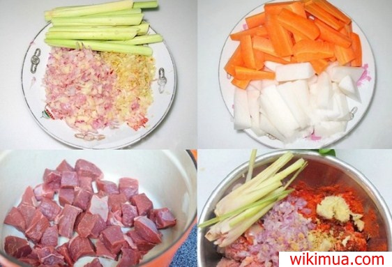 Cà rốt, khoai tây : Cạo sạch lớp vỏ bên ngoài, rửa sạch rồi thái thành miếng vuông để khi nấu không bị nhừ nát.