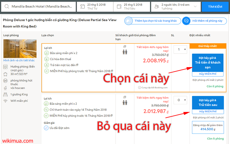 Bước 4: Bạn tìm khách sạn phù hợp và tiến hành xem chi tiết thông tin khách sạn, giá phòng. Ở đây bạn sẽ thấy có hai lựa chọn đặt phòng: “Đặt bây giờ và trả tiền sau” và “Đặt bây giờ & trả tiền ở khách sạn”. Bạn nhớ lựa chọn hình thức “Đặt bây giờ & trả tiền ở khách sạn” nhé. Vì đây là hình thức không cần nhập thông tin thẻ khi đặt phòng. Hình thức “Đặt bây giờ và trả tiền sau” vẫn phải nhập thông tin thẻ nên bạn bỏ qua nhé.