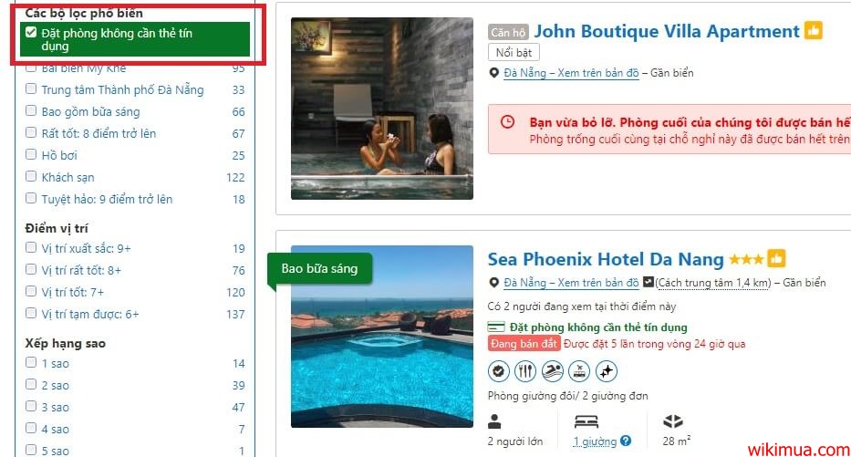 Tương tự trên Agoda, bạn cũng có lựa chọn để lọc các phòng khách sạn mà không cần thẻ tín dụng như dưới đây. Bạn nhớ Click vào lựa chọn này để xem các khách sạn chấp nhận hình thức đặt mà không phải thanh toán tiền ngay nhé.