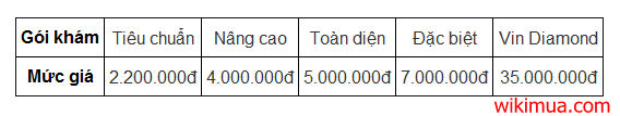Hiện nay, Vinmec cung cấp khá nhiều gói khám sức khỏe tổng quát khác nhau. Trong đó 4 gói đầu có giá dưới 1 triệu, riêng gói khám tổng quát Vin Diamond có giá rất cao (35 triệu VNĐ). Mức giá niêm yết các gói khám tổng quát hiện nay ở Vinmec bạn có thể tham khảo dưới đây.