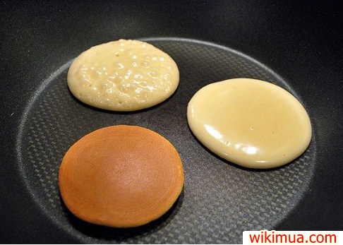 Chuẩn bị một chiếc tô, cho bột mỳ, bột nở , mật ong, trứng gà, 1 chút nước lọc vào đánh tan hỗn hợp này lên, kết quả phải được một loại bột không đặc quá, lát chúng ta nướng trên chảo được.