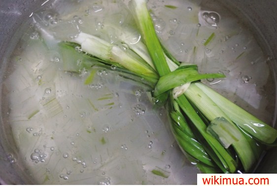Chúng ta chuẩn bị một nồi inox, cho lá dứa vào nấu cho sôi lên cùng vài hạt muối. Khi nào nước sôi thì chúng ta cho thêm đường phèn vào. Lượng đường phèn tùy thuộc vào khẩu vị của gia đình mình. Ăn ngọt thì cho nhiều đường phèn, ăn ít thì chúng ta sẽ giảm đi.