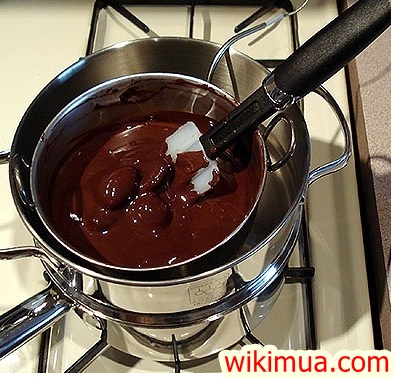 Dùng lò vi sóng nếu có làm tan chảy socola ra , nếu không có chúng ta sẽ làm bước tự nhiên là hấp cách thủy, đổ chút nước đun nóng socola phía trên sẽ chảy ra chúng ta được hỗn hợp.