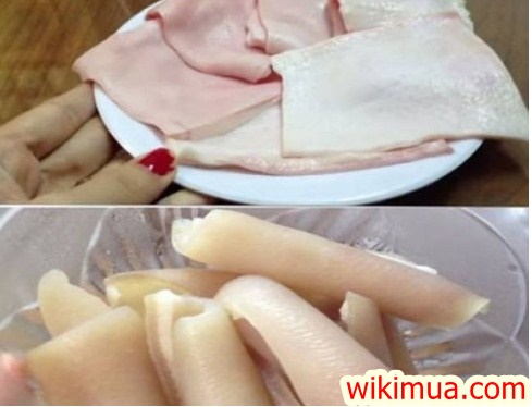 Lấy phần bì đã sơ chế lúc trước, nếu khổ dài chúng ta có thể cắt làm sao cho đủ kích thước quấn khoanh giò.