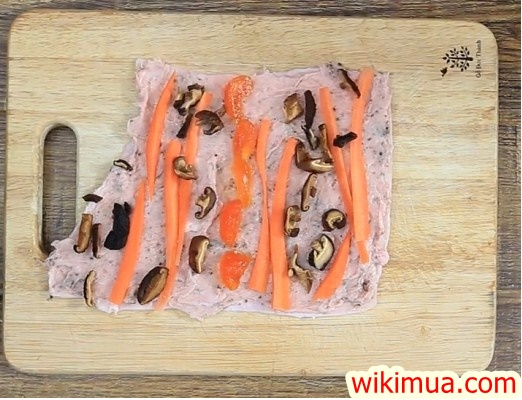 Trải đều bì ra, rắc chút bột năng lên bề mặt bì, điều này giúp cho phần bì và giò có sự liên kết nhiều hơn,tiếp theo cho giò sống trải lên mặt bì, giàn đều, dùng thìa ninox nhỏ trải thật chặt . Chúng ta đặt tiếp trứng muối, đậu bắp, cà rốt, nấm hương, mọc nhĩ lên trên nhé.