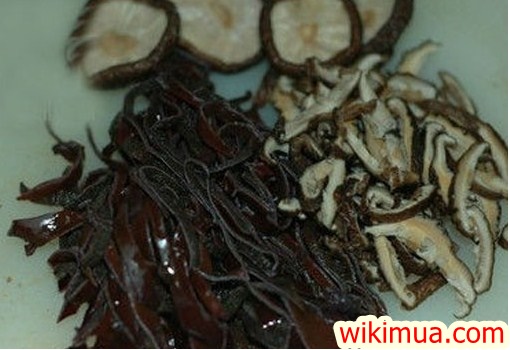Mọc nhĩ, nấm hương : Cho ngâm trong nước nóng để nở ra, cắt bỏ phần chân đi, rửa sạch bằng nước sạch để ráo lát chúng ta thái lát sợi mỏng để chuẩn bị gói giò.