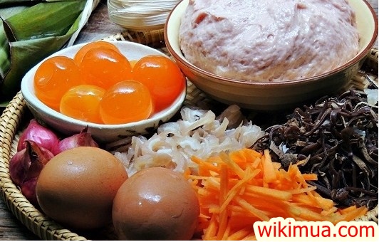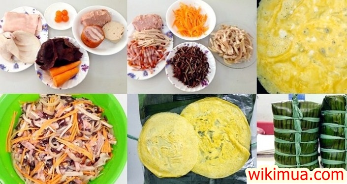 Trải một lớp trứng đặt bên ngoài cùng, sau đó cho hỗn hợp thịt tai lợn để bên trong, nén chặt để chúng ta cho tiếp nấm hương, mọc nhĩ, trứng gà rán, trứng muối và không thể quên phần lạp xường nhé.