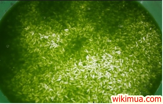 Lá dứa chúng ta rửa sạch, đem xay nhuyễn bằng máy xay sinh tố cùng nước lọc. Xay xong chúng ta rây lọc qua 1 lượt, được lượng nước xanh chúng ta đem ngâm với gạo nếp.